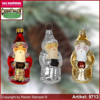 Sammlerserie "Lauschaer Form" - Weihnachtsmann mini. Der Weihnachtsmann, Symbol der von den Kindern sehnsüchtig erwartete Geschenkebringer, aber auch gefürchtet als Strafender. In den Grundfarben Silber, Rot  oder Gold nach historischen Vorlagen handbemalt.